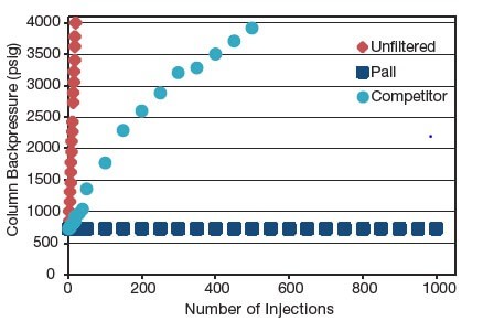 Effects of filters on HPLC column life following injections of unfiltered and filtered 0.05% latex sphere suspensions. With unfiltered samples, the column failed due to plugging after 19 injections. Samples passed through competitor filters plugged the columns after 500 injections. No increase in backpressure was observed after 1000 injections of samples filtered with Pall Acrodisc One syringe filters.